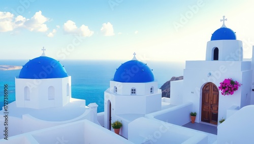 Beautiful santorini landscape with white buildings and blue domes on a sunny day