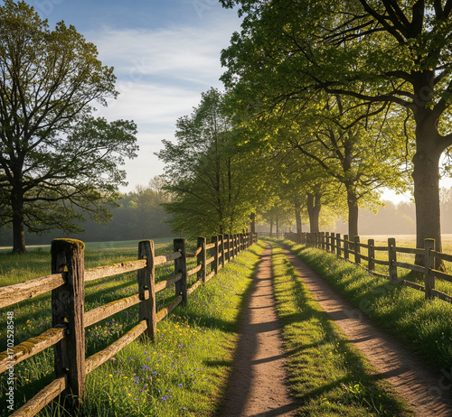 "Beautiful scenic landscape photography, wide angle, ultra realistic, nature path with fences, trees, flowers, rivers, mountains and atmospheric lighting, highly detailed, cinematic view, natural colo