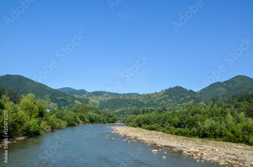 Beautiful scenic view of a serene Cheremosh river flowing through a lush forest with mountains in the background, under a clear blue sky. Carpathian Mountains, Ukraine