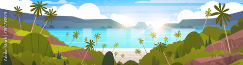 Beautiful Seaside Landscape Summer Beach With Mountains, Blue Water And Palm Trees Exotic Resort Horizon Flat Vector Illustration