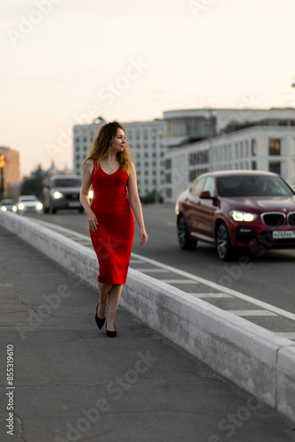 Beautiful self confident young woman in a red dress walking down the street. Urban cityscape. Concept of freedom, feminism, female strength. Summer, sunset light