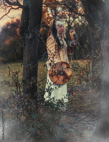 beautiful shamanic girl playing on shaman frame drum in the nature.
