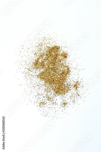 Beautiful shiny gold glitter on white background, top view