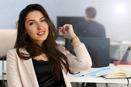 Beautiful smiling girl at workplace look in camera portrait. White collar dress code worker at workspace job offer modern office lifestyle client visit study profession boss market idea coach train