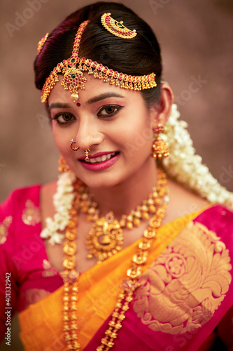 Beautiful smiling Indian bride with jewelry in studio shot.