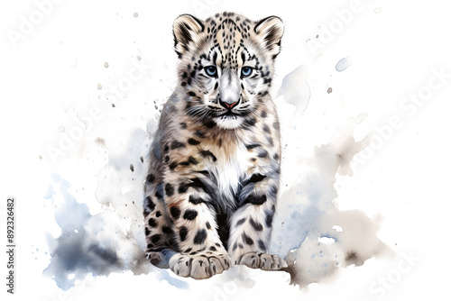 Beautiful snow leopard cub, panthera uncia, standing on a snowy ledge. Digital watercolour on white background.