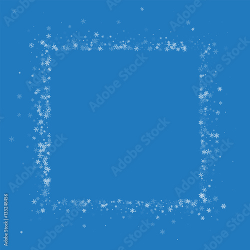Beautiful snowfall. Square abstract border on blue background. Vector illustration.