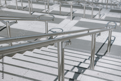 Beautiful stainless steel handrails are installed on the walls and steps at football stadium.