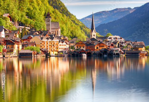 Beautiful summer Alpine Hallstatt Town and lake Hallstatter See view Austria