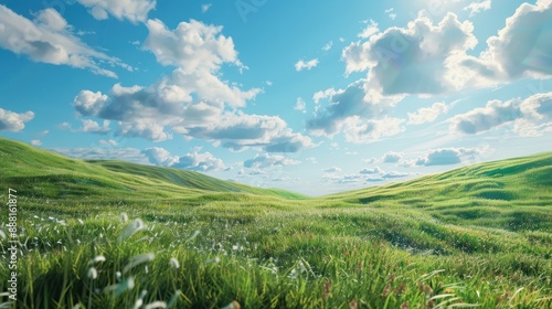 Beautiful summer landscape with green meadow and blue sky with clouds, Hilly green landscape view with green grass and beautiful sky, AI Generated