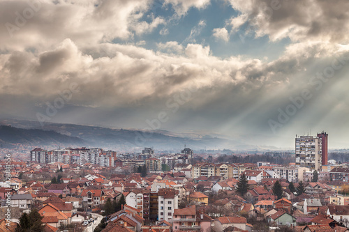 Beautiful sun rays casting light on Pirot cityscape during morning and cloudy, colorful sky