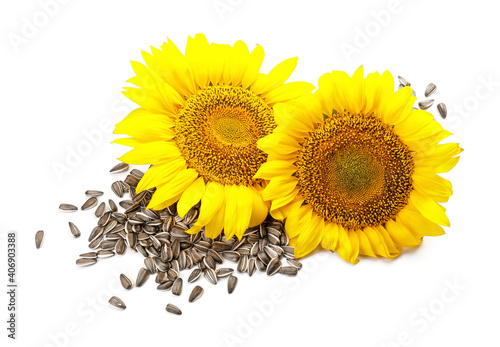 Beautiful sunflowers and seeds on white background