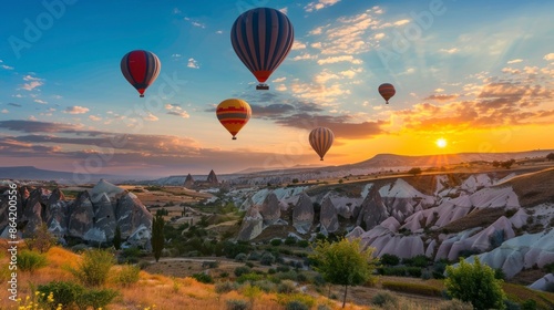 beautiful sunrise in cappadocia with balloons flying