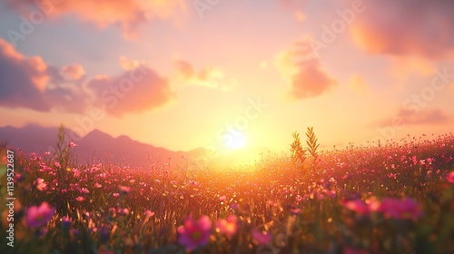 Beautiful Sunset Landscape Over a Meadow in Evening