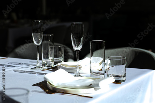 Beautiful table setting with dishes,in a restaurant,light-shadow pattern and style