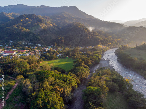 Beautiful Tropical Valley with river and rainforest in Mexico, Oaxaca state. Aerial drone photo