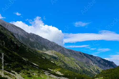 Beautiful view on the high green mountains peaks, on the blue sky background. Mountain hiking paradise landscape, no people.