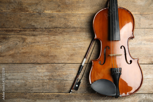 Beautiful violin and bow on wooden table, top view. Space for text