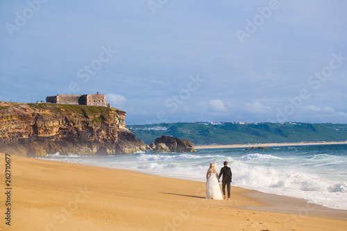 Beautiful wedding couple posing on beach