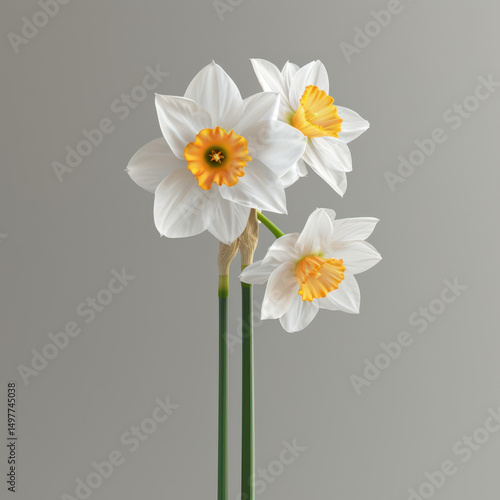 Beautiful White and Yellow Narcissus Blossom with Stem on White background JPG jenerative with A.I.