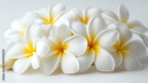 Beautiful White Plumeria Flowers with Yellow Centers on White Background, Close-Up