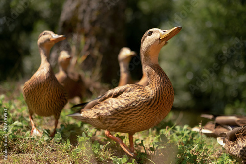 Beautiful wild gray duck in forest waiting for food outdoors in summer,close-up