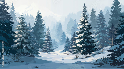 Beautiful Winter Landscape Illustration with Snowy Pine Forest and Mountains at Dawn