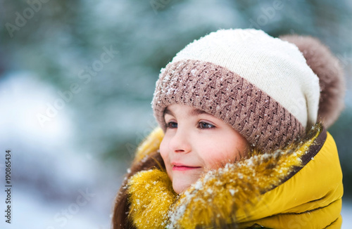Beautiful winter portrait of a child outdoors. Face of girl close-up with snowflakes on eyelashes