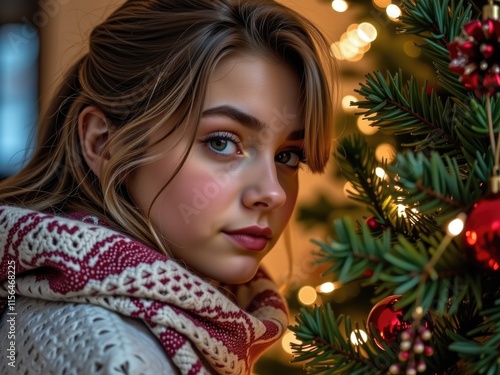 Beautiful Woman by Christmas Tree Festive Season Portrait