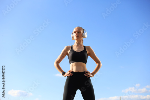 Beautiful woman in sports clothing and earphones looking aside from camera.