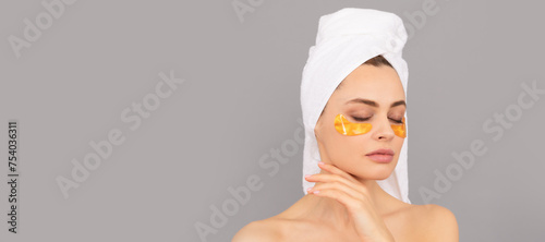 Beautiful woman isolated face portrait, banner with mock up copy space. Let the skin breathe. moisturizing skin. cosmetology. young woman in terry towel use patch.