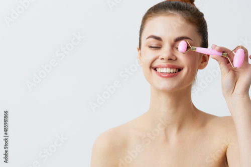 beautiful woman jade face massager wrinkle smoothing tied hair in a bun isolated background