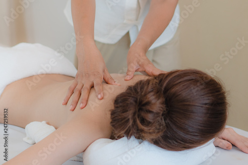 Beautiful woman lying down on the bed relax in spa salon with massage.