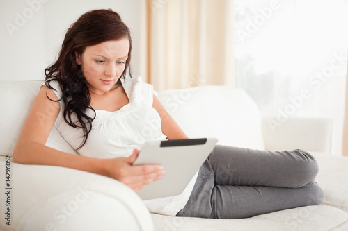 Beautiful woman relaxing on a sofa surfing the internet with a