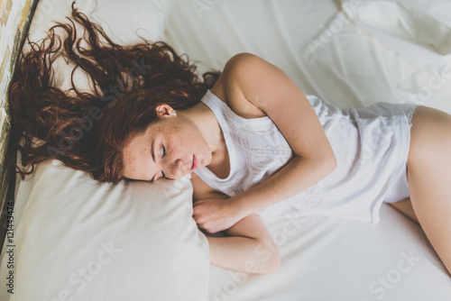 Beautiful woman sleeping on white bed