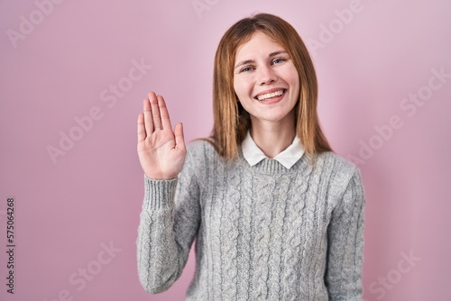 Beautiful woman standing over pink background waiving saying hello happy and smiling, friendly welcome gesture