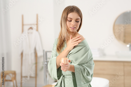 Beautiful woman with jar of cream wearing stylish robe in bathroom