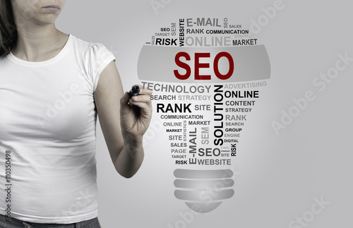 Beautiful woman writing - SEO (search engine optimization) bulb
