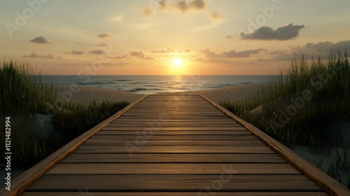 Beautiful wooden pathway leading to the serene beach at sunset