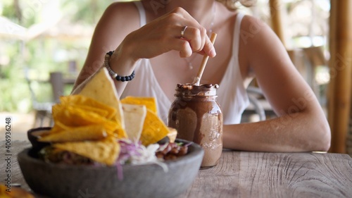 Beautiful young blonde woman enjoys her chocolate milkshake while having lunch alone at a beach restaurant. Solo travel