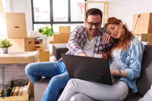 Beautiful young couple shopping on-line using a laptop and smiling while sitting among cardboard boxes in their new apartment