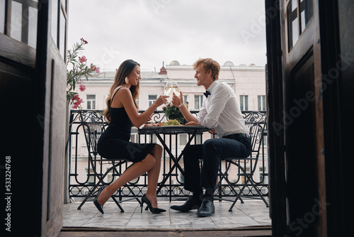 Beautiful young couple toasting with champagne while having a romantic dinner on the balcony