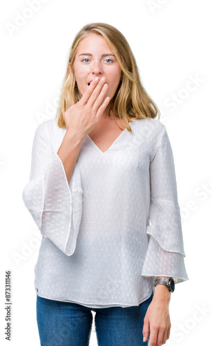 Beautiful young elegant woman over isolated background bored yawning tired covering mouth with hand. Restless and sleepiness.