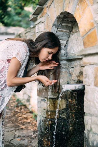 Beautiful, young girl drinks spring water outdoor