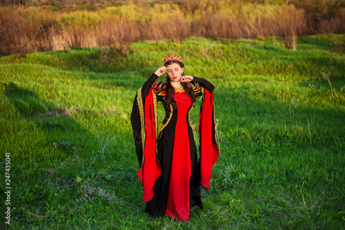beautiful, young girl in black and red medieval dress with crown on head.