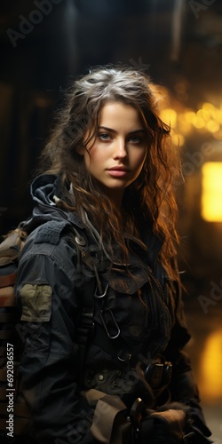 Beautiful young girl in full length military uniform with weapon in hands
