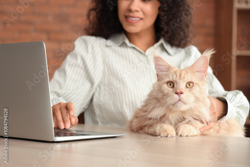 Beautiful young happy African-American woman working with laptop and her cute Maine Coon cat at home, closeup