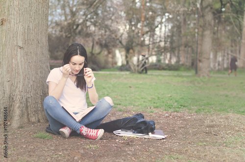 Beautiful young school or college girl with long hair and eye glasses sitting on the ground in the park reading the books and study for exam