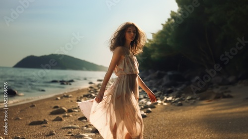 Beautiful Young Woman in an elegant white dress standing on a beach. Generative AI illustration.