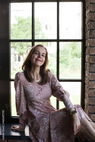 Beautiful young woman in pink dress resting on the windowsill. Happy smiling girl sits on the stained glass window at industrial loft wooden brick style interior. Leisure concept.